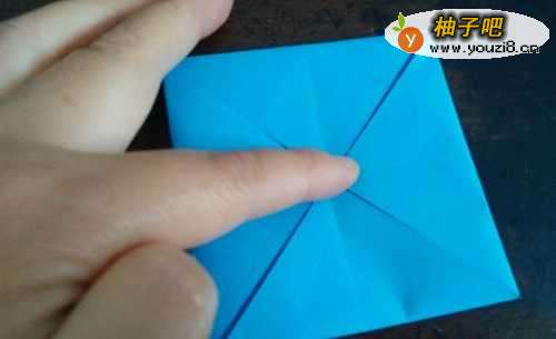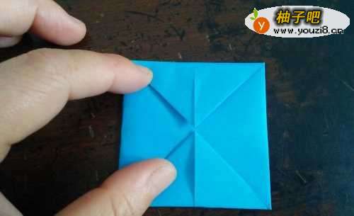 我们先把正方形彩纸的中间折出个米字型,如图。