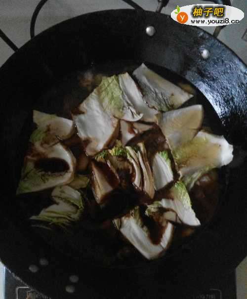 2把洗净的大白菜放入锅内打底,防止沾锅。锅内放入少量的水并放入适量的酱油。