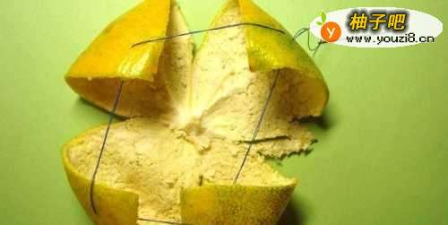 4接着,用针将桔子皮穿线连接起来,并固定好位置,如下图所示。