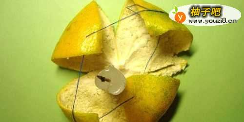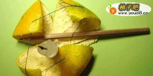 6最后,用铅笔或小树枝把穿好线的桔子皮提起来,这样简易的小桔灯就做好了,大家也来动手做做吧。
