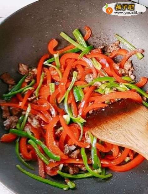 5再把准备好的青椒和红椒一起倒入锅里面翻炒,直至炒熟。