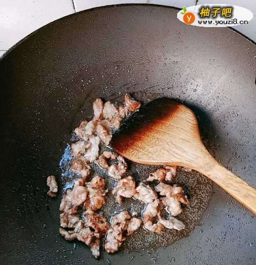4将油倒入锅里面,待油开把腌制好的肉倒入锅里炒熟。
