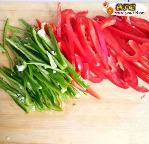3将青椒、红椒切成丝待用,切小一点更入味哦。