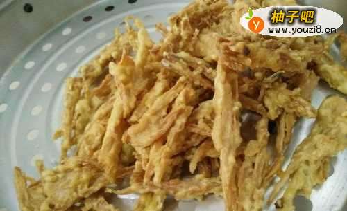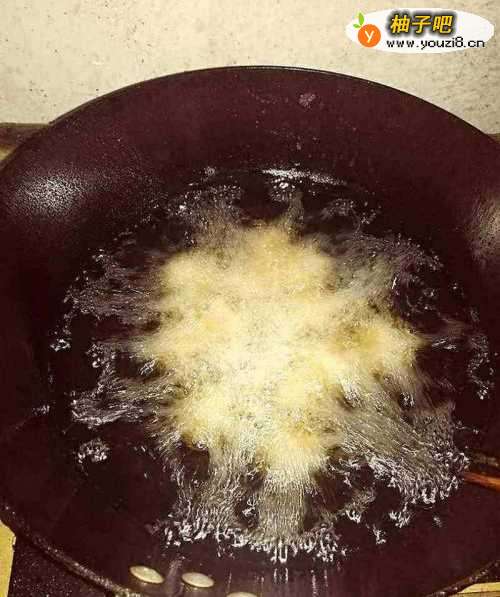 4注意,这时候火候一定要掌握好,不能开太大,以免烧焦。所以,一定要选择小火慢炸,让其变成金黄色时,再将其盛放入盘子中。