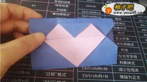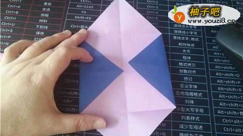 3我们再把上下两个角启用,如图一。再把下面的角向上折到上面的折痕,如图二。