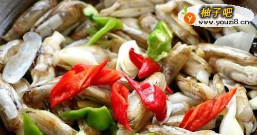 4放入蛏子、青红椒块;
