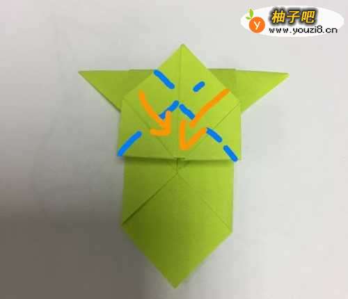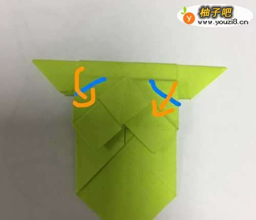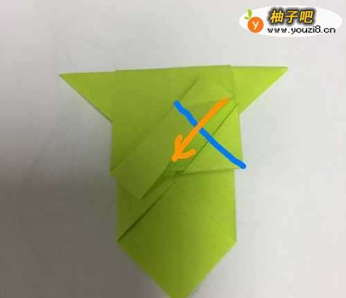 把上部份的折纸沿着蓝色虚线向后翻折,折好之后再沿着蓝色虚线翻折回来,形成一条凸槽。