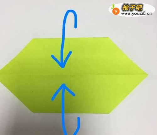 将六边形翻到另一面,将折叠出三角形的那一边向中间的对角线折叠,两边都折好之后,把折纸从中间对折。然后将下面的角对折翻到上面。