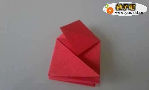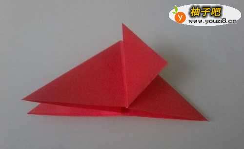 7把折好后的两个小三角形的尖,往下折。爱心的基本形状就折好的。