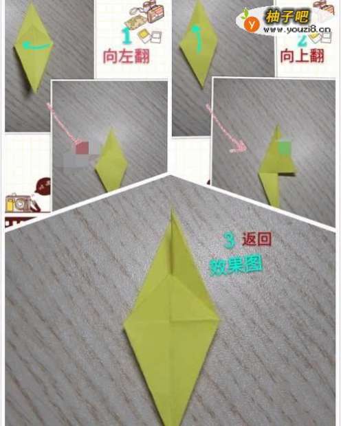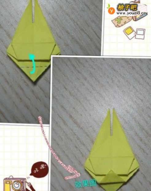 22将底尖角沿所画虚线向上翻折(反面亦同)!效果如下!