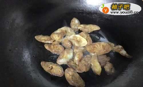 3接下来开火,锅烧热之后放入适量油,油不用太多,油热之后把香肠导进去煸炒一下,如果不是蒸熟的香肠,炒至香肠变色,油脂出来即可。