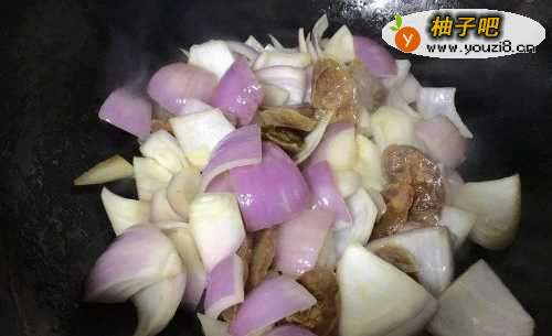 4紧接着将切好的洋葱倒进过里面翻炒,开大火翻炒片刻。