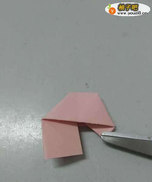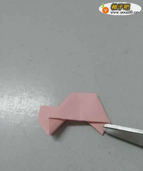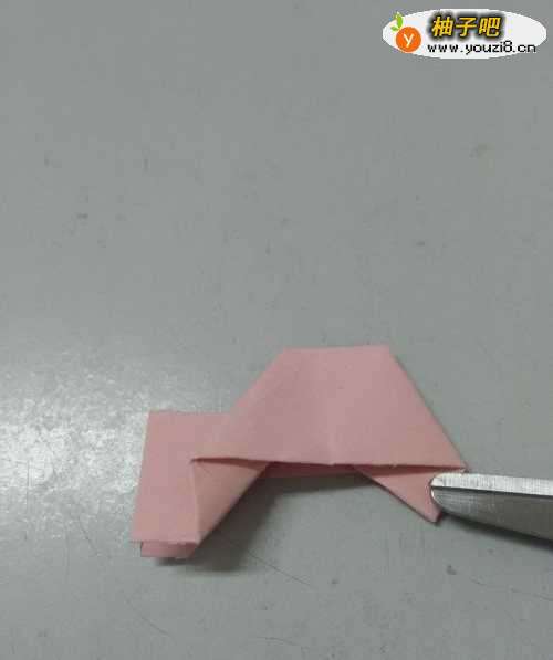 5将长方形右侧的边从内侧向下折,多出来的小尖当作后面的车轮。