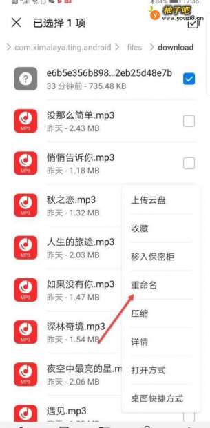 1.开启喜马拉雅,找到音乐文件的储存位置。2.开启手机上的文件管理/内部存储。3.找到该音乐文件,点击更多。4.点击重命名,直接修改为mp3文件。