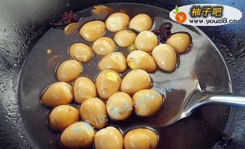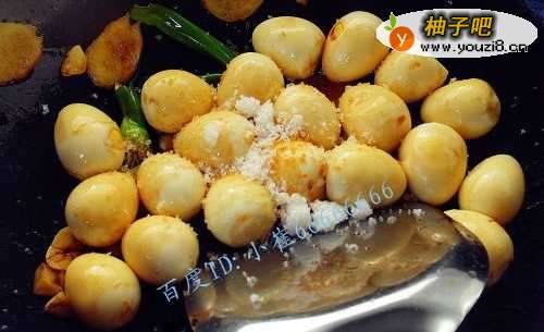 7然后倒入鹌鹑蛋,同时加入适量的酱油,白糖,大料,十三香。
