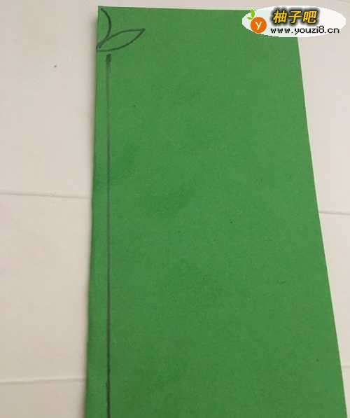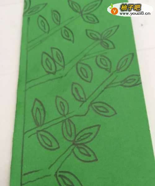 2第二步 折叠完之后 拿起绘图铅笔 在双边的上头画上两三片树叶 向下画上小树的半个树干