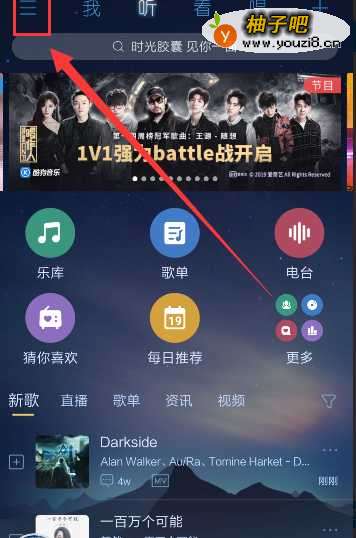 2进入酷狗音乐,点击左上角的三,如图所示