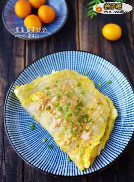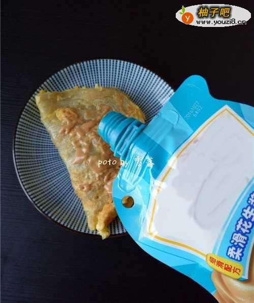 7手抓饼卷起盛出,面上再挤上适量花生酱;