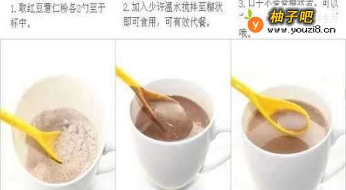 5取少许红豆薏米粉于杯中,加入适量温水即可。