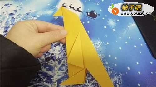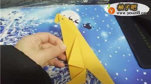 5折好后,我们把上面的角向下折,如图一。再把尖角向内折,如图二的样子,鹦鹉的嘴巴就出来了。