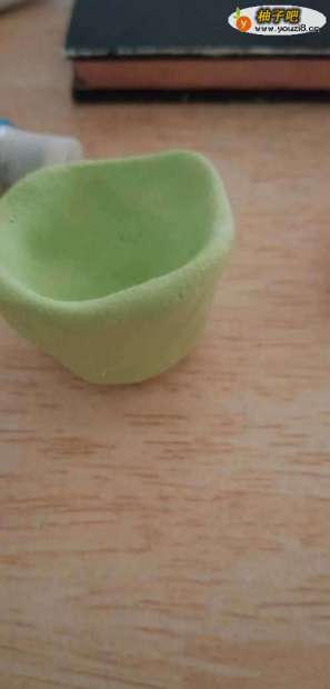2同上步一样,在白色粘土里混入藤黄和一点点花青调成青黄色的粘土,捏成碗状,这里绿色粘土不要太多