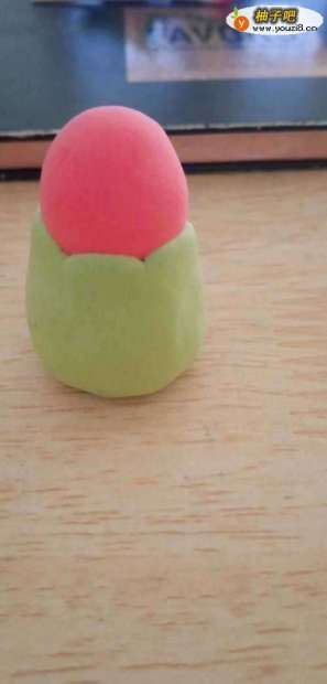 3接着将粉红色球形粘土轻轻放在绿色碗状粘土上面,将边缘处用手捏的平滑些,这样小猪的身体就做完了