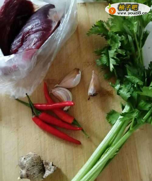 准备要用到的食材:适量黄调瞧牛肉、芹菜、小米辣、蒜瓣及生姜,清洗干净。