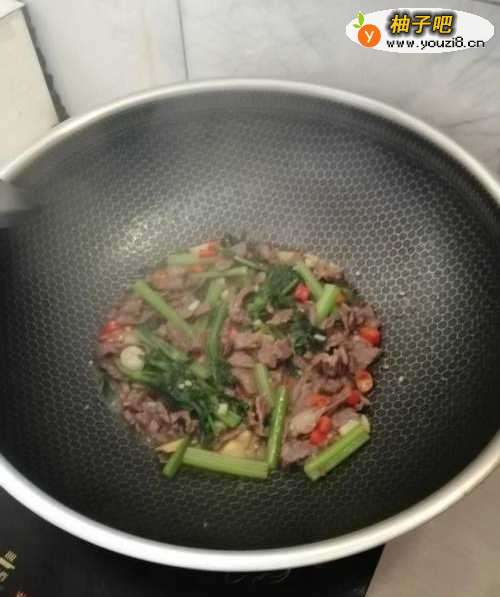 4起锅烧热油,油热后放入切好的姜蒜小米辣爆香槐针,然后倒入腌制好的牛肉翻炒,接着倒入芹菜翻炒均匀,加一点清水焖一会儿。