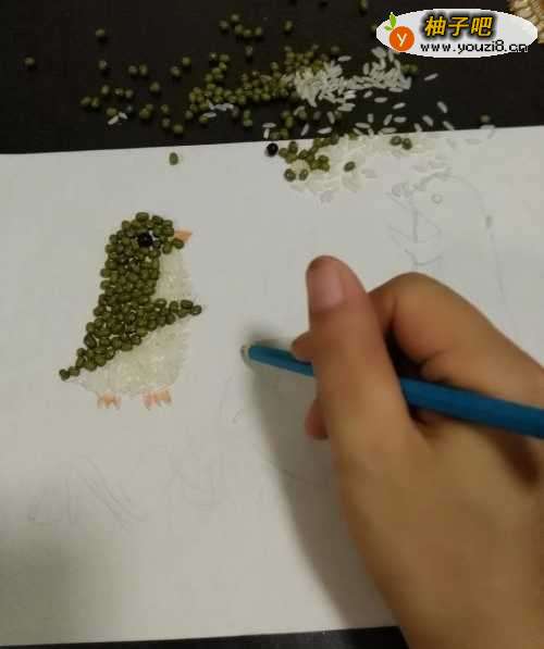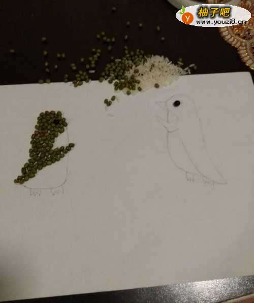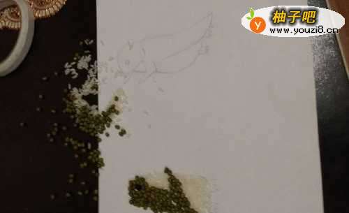 3背部的绿豆放好后,就能在肚子部分放入大米,背和肚子有铅笔划分,只要在相应区域放入大米就能粘住了。这里也能和宝宝一起执行,让宝宝体验。