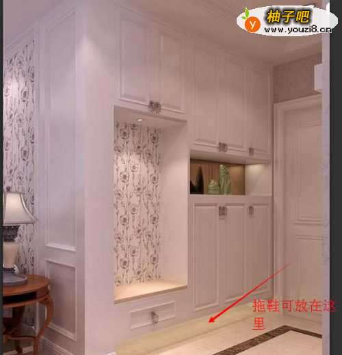 6鞋柜下方最好腾空150mm,这样能将要换的拖鞋和经常穿的鞋放在下面,这样就不必经常开关鞋柜门。当然这个尺寸能根据实际情况调节。