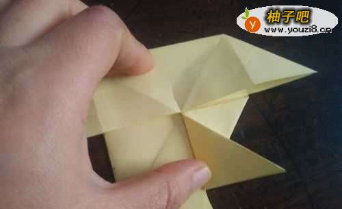 2启用彩纸后,我们把四个角分别向内折,然后再启用彩纸。再把四条边向着中线对折。