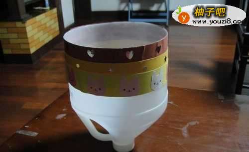 2把各种颜色的卡纸剪成条状,然后贴在瓶子边缘,按照自己的喜好装饰瓶子