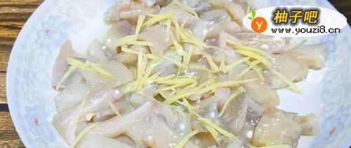 4把姜丝放在鱼肉上面,再倒一点料酒撒一点淀粉,用手抓拌均匀腌制15分钟。