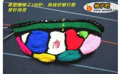 2中间片织法:起11针,开始织平针,在从两边数2针处,隔一行分别加1针,一直加到针数为19针时开始减针,位置和加针时一样。减至11针时,用另一种颜色的线织出一道反针,然后再开始加针,同前面说得一样,重复3次,共四个小块。