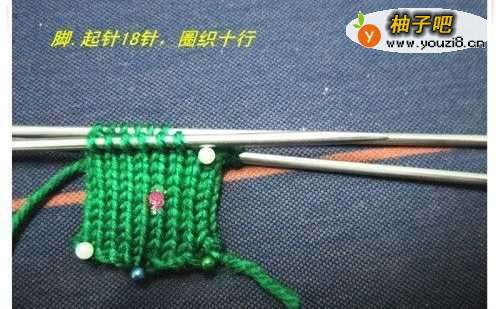 7脚、尾:起18针,转圈织平针。织10圈后开始织片,从任意一处留3针开始,每圈两边各加一针,织出一个弯状,剩一针时开始收针,就像我们织鸡心领毛衫时收领口一样,三针并一针,每行都并,真到收完,这时一个弯弯的尖脚就完成了,共织四只脚。尾:起18针,织平针。织12圈后开始减针,减出一个尖尖的尾巴就能了,全长两寸左右。