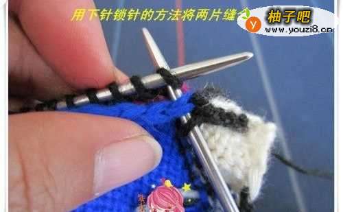 6背部和腹部缝合。用织反针道时的线,先把背部顺着边沿挑针,共挑122针,基本是每个小辫1针,织3圈后换原来的深色线,织6圈,再换回浅色线织3圈,不收边,就穿着针待用。然后将腹部也以同样的办法织出一个边来,两片缝合时,反针冲上,也就是腹部对着我们进行缝合,让缝合时留下的小辫在腹部。 这一步的核心是:两大片的位置一定要对好,腹部与背部要对称,否则,整个形状会扭曲,不好看。到这儿主体基本完成。