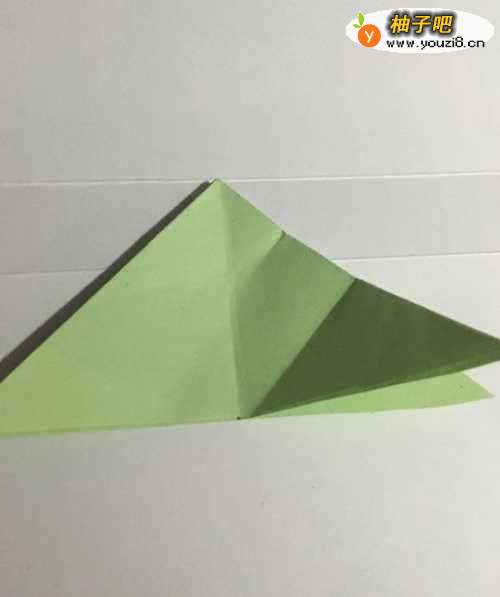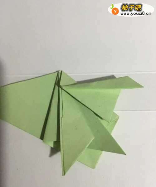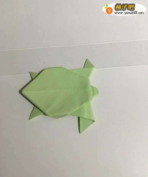 7第七步 两边的两只前脚都折好之后 再折叠头部 先向下折叠再向上翻折 然后再折小乌龟的壳 把两边的尖角折进背面 最后整理一下 一只可爱的小乌龟就折叠完成了