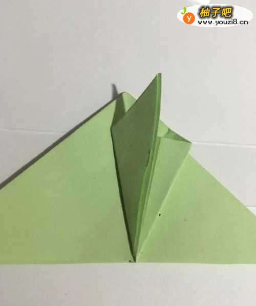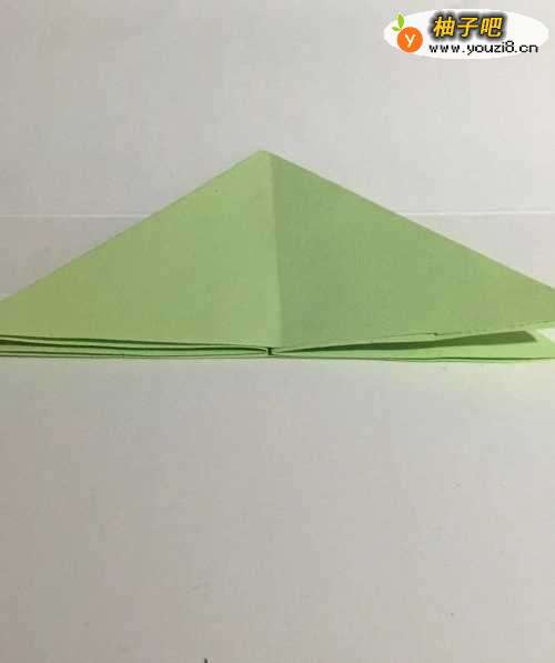 5第五步 折好右边之后 左边同样折叠 然后旋转一下角部朝下 再拿起右上角向左下顺双边包折 最后再向右上方向翻折 下边在豁口处 上边在左边双边的附近折倒