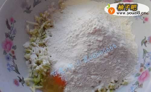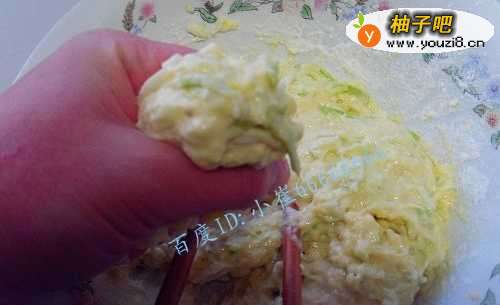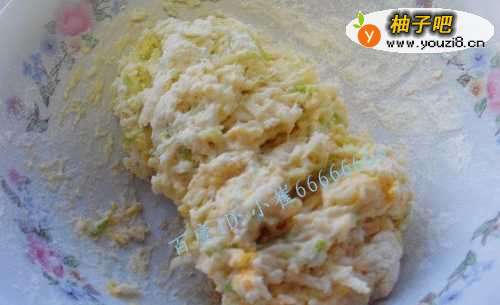 4往角瓜鸡蛋面里加入适量的盐,水,少许的白糖,搅成如图所示的面糊,不要太稀哦,否则就不成丸子了。