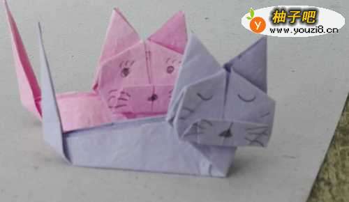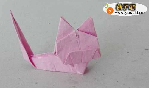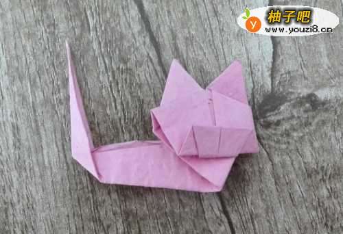 13把小猫面部的两个角沿后面的纸痕折到后面去,再如图所示压到里去,再压平压实,折好,整理一下