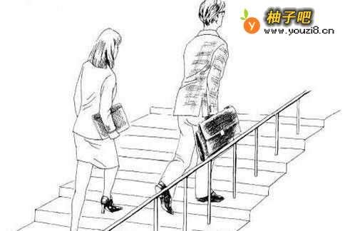 女士引领男宾,宾客走在前面; 男士引领女宾,男士走在前面; 男士引领男宾,上楼宾客走前;下楼引领者走前;若宾客不清楚线路,则引领者走 前。