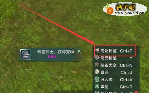 2添加完阳阳后,鼠标浮动到游戏界面的右下角倒数第二个按钮上,点击弹出框中的【宠物秘鉴】按钮。
