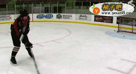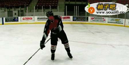 3在移动冰球的同时,在前的一只脚转向球门方向,同时旋转身体,将身体打开,使整个身体面向球门。球杆将球往前送,也同时将身体向前送,这时注意手和球杆都在身体的前方。