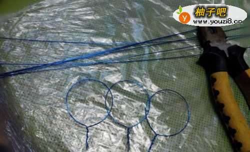 2找到蓝色的有弹性的丝网,套在第一步做的铁环上,不要太紧也不要太松,尾端不要留太多的丝网,用剪刀剪掉。