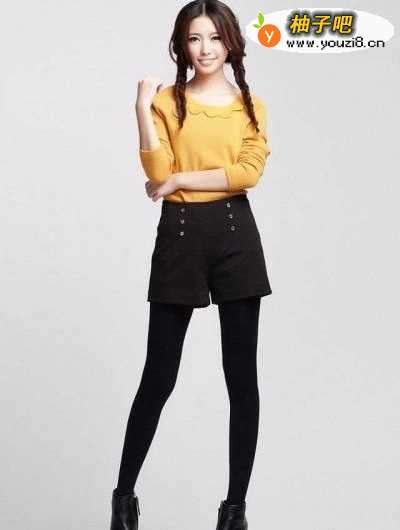 如果你想穿短款的小衫,又想穿比较显体型的打底裤的话,那么你就一定要搭配一条好看的短裤,根据你打底裤的颜色来搭配短裤的颜色,是皮裤还是呢子料的裤子,均可。