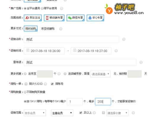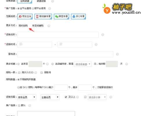 4依次选择促销渠道,推广范围。更多方式选择限时抢购。促销名称可以填写产品利益点之类,用于自己识别促销活动。