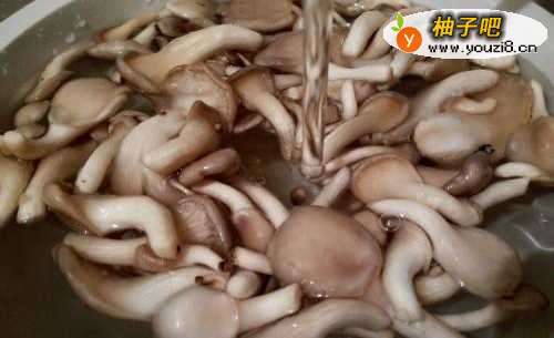 2秀珍菇放盆里,加一点盐,加水清洗干净