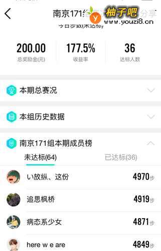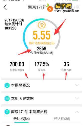 5我的是”南京171组赛况“,此页面的内容较多,首先看到的是比赛的概况:预计达到的金额5.55元,今日走的步数2659步,本组总奖励金200元,目前的收益率是177.5%,目前的达标人数是36人。再下面就是”本期总赛况“、”本组历史数据“和”本组本期成员榜“