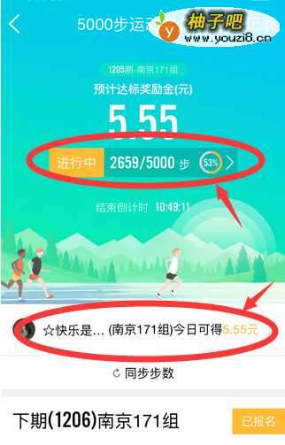 3进入“当日赛况”页面有两种方式,第一种就是点击“QQ5000步运动奖金赛页面”预计达标奖励金数字下方的”进行中 2659/5000步 53% >“进入。第二种就是点击首屏中间位置,有个小头像,后面是QQ名“(南京171组)今日可得5.55元”位置点击进入。如下方箭头位置。