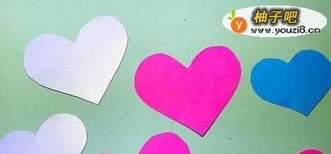 2然后用硬纸板剪出两个一大一小的爱心,红色纸剪出两个相同大小的爱心,另外再剪一个小一点的,蓝色纸剪一个和硬纸板的小爱心同样大,一共要剪6个爱心,如图所示。